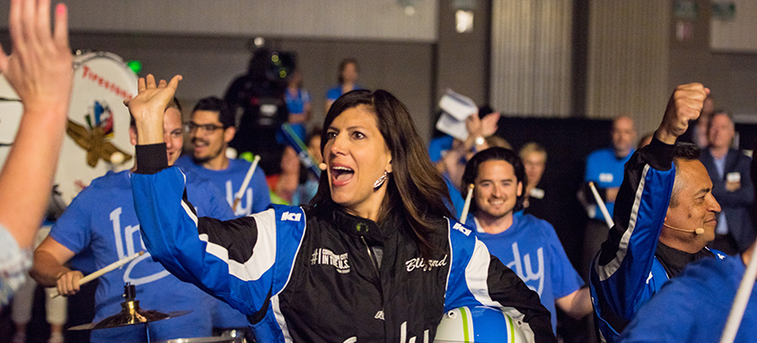 Attendees walked into the morning pep rally at Indiana Convention Center to a cheer line of greeters. Later, moderator Dena Blizzard and speaker Visit Indy CEO Leonard Hoops bounded in wearing auto racing suits, accompanied by a drum line. Instead of talking about how to create excitement and inspiration, they showed it with a poetry slam-style speaker delivering a message about the planner’s role as artist.